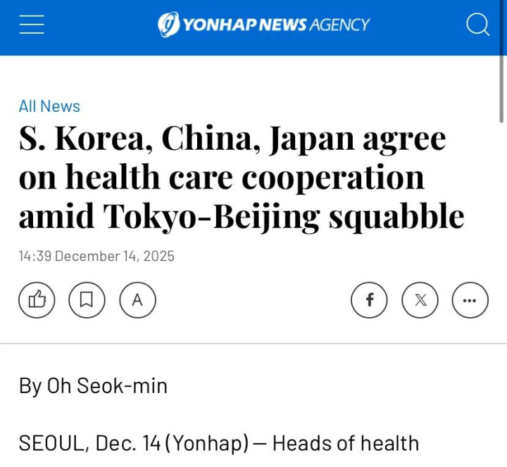 12月14日,韩国和日本的卫生部门都对外表示,在韩国召开了中日韩第18届三边卫生部长会议,达成了联合声明。